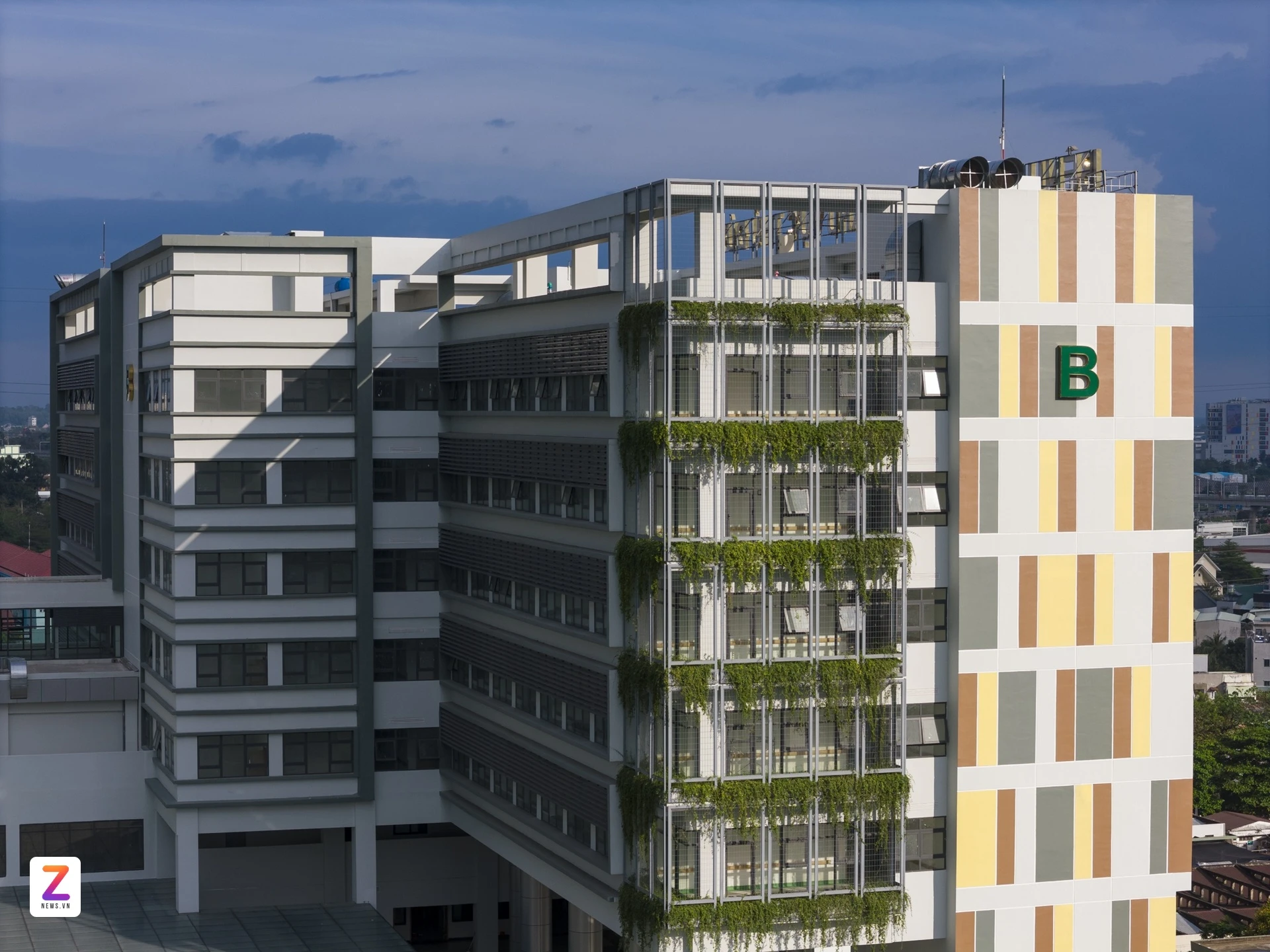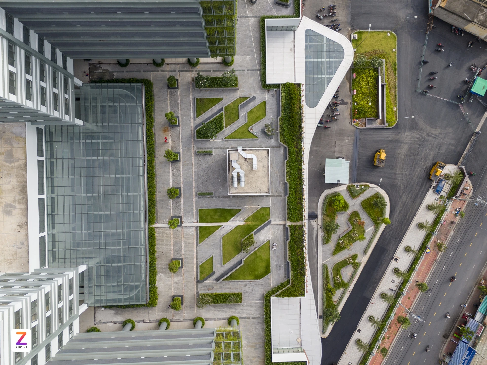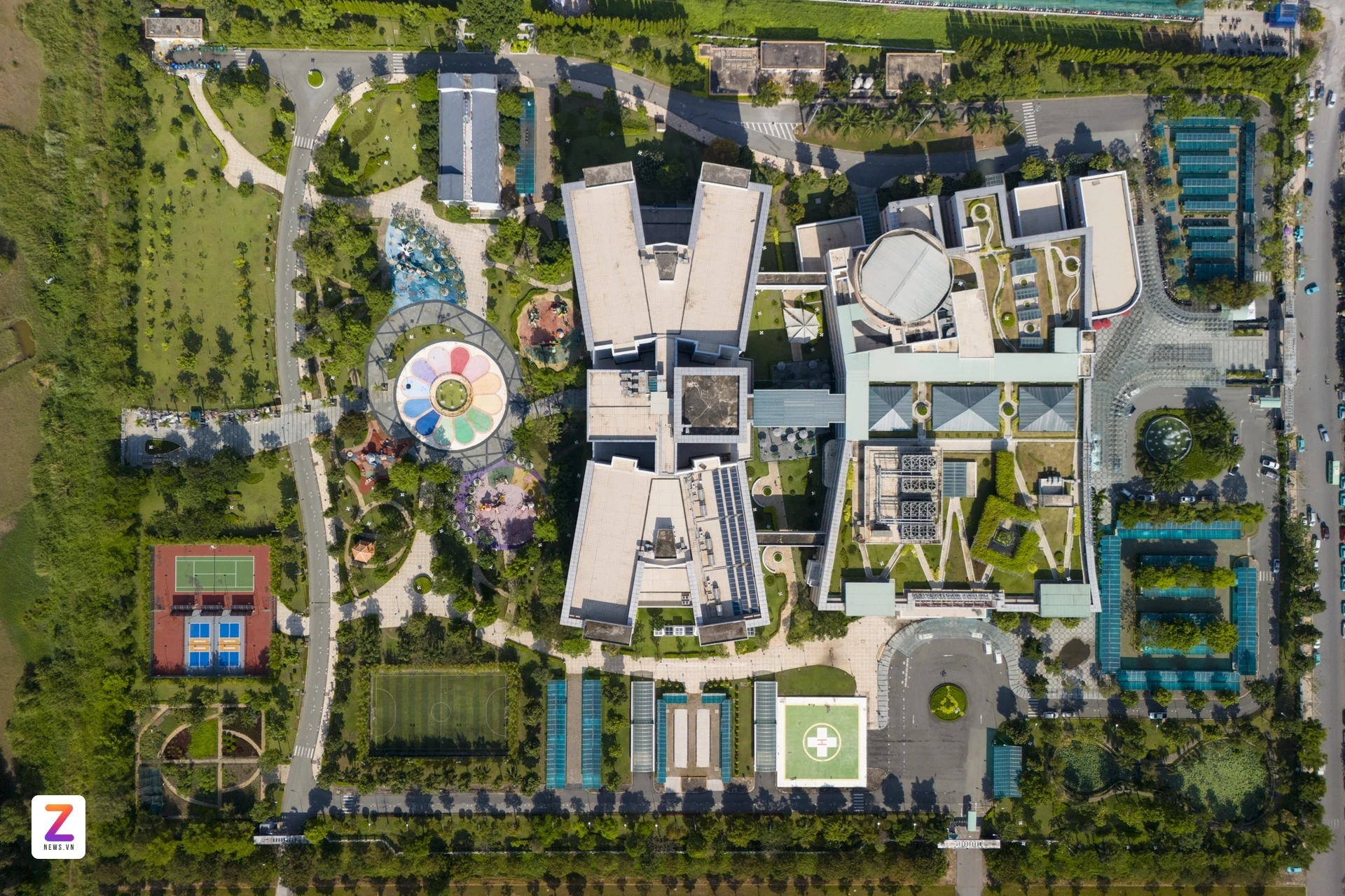 Thay vì những khối bê tông khô cứng, bệnh viện được thiết kế tràn ngập sức sống với khu cảnh quan xanh mát rộng 6.200 m² được bố trí ngay trên tầng 3. Không gian được ví như một công viên mini trên cao, với lối đi tản bộ và hàng ghế, tạo sự thư thái, xoa dịu người bệnh và thân nhân trong suốt quá trình điều trị.