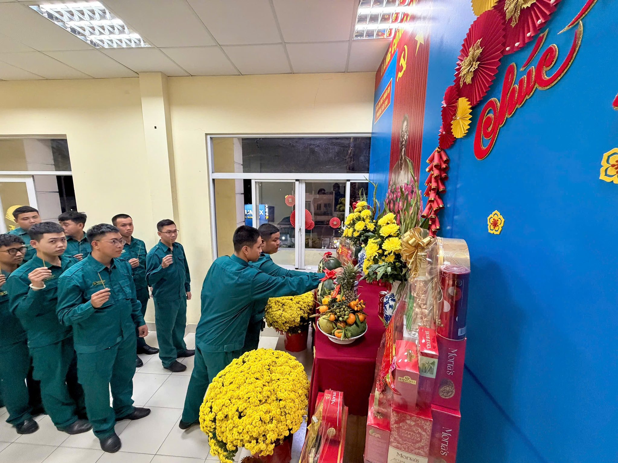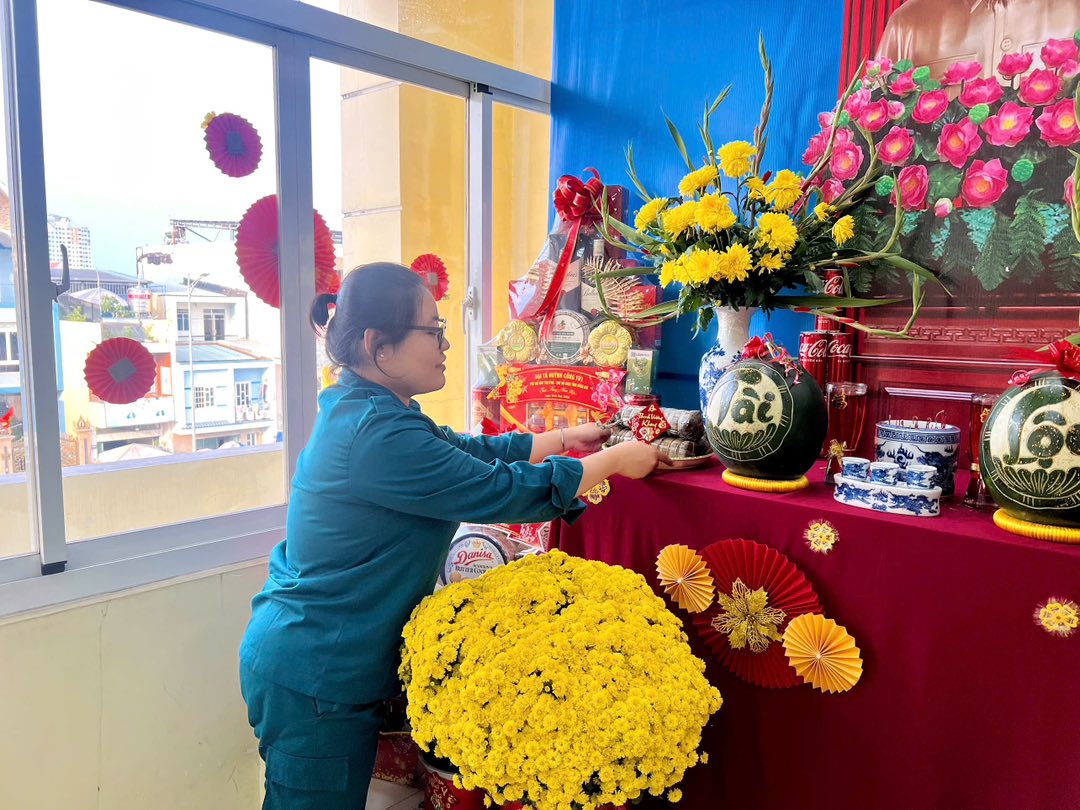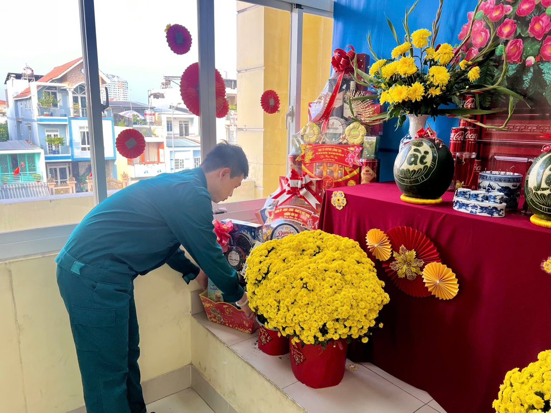 Trong không khí rộn ràng của mùa xuân mới, khu vực bàn thờ được chuẩn bị chu đáo với Quốc kỳ, ảnh Chủ tịch Hồ Chí Minh đặt ở vị trí trang trọng, cùng mâm ngũ quả, bình hoa tươi và bánh mứt ngày Tết. Từng chi tiết được sắp xếp hài hòa, vừa đảm bảo tính nghi lễ, vừa tạo nên không gian ấm cúng, thiêng liêng tại trụ sở đơn vị.