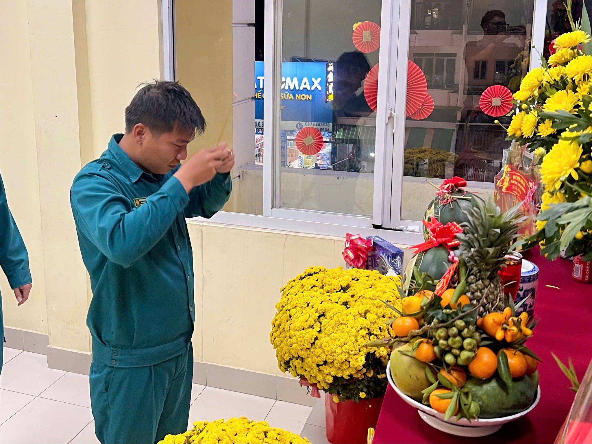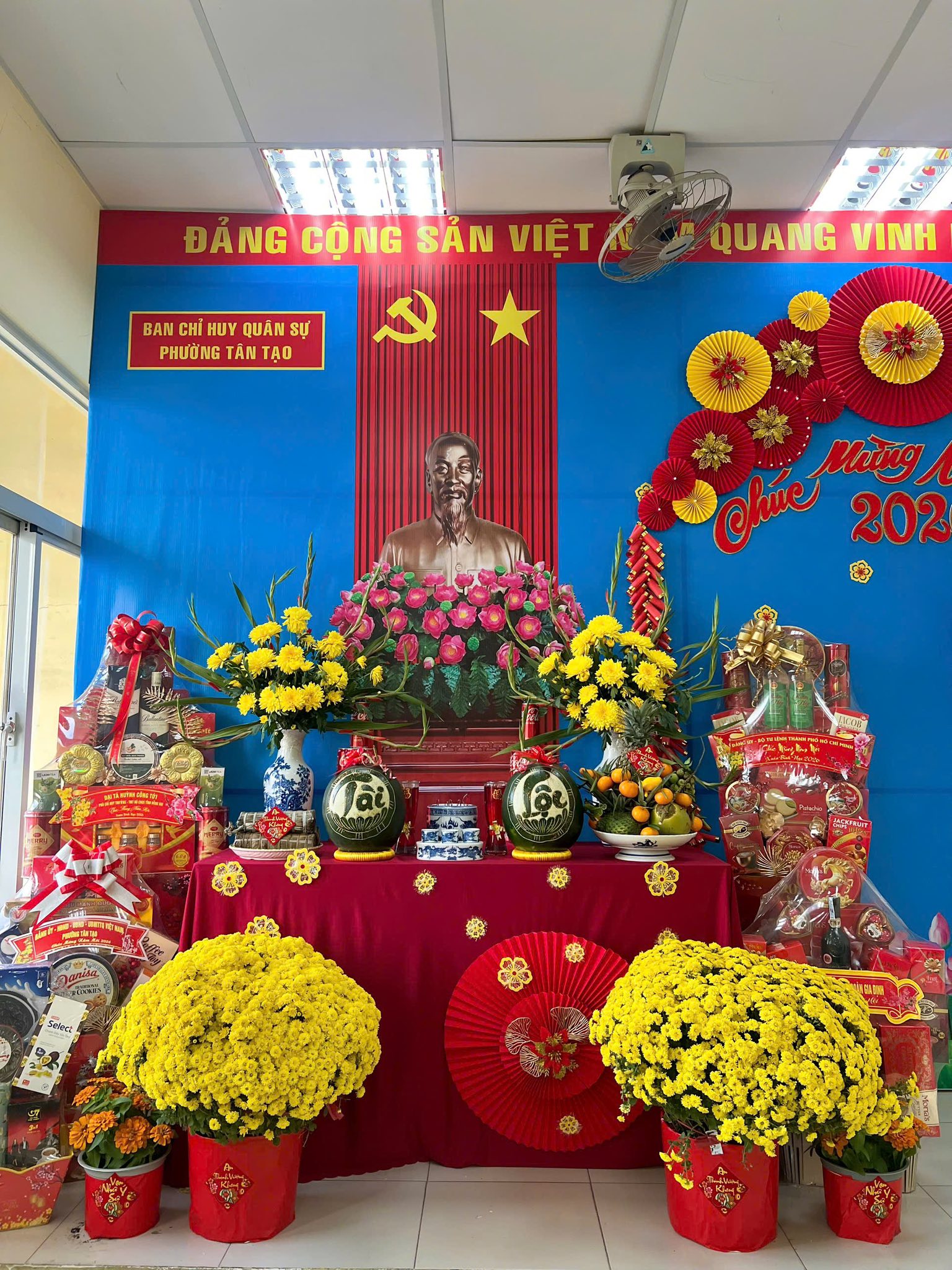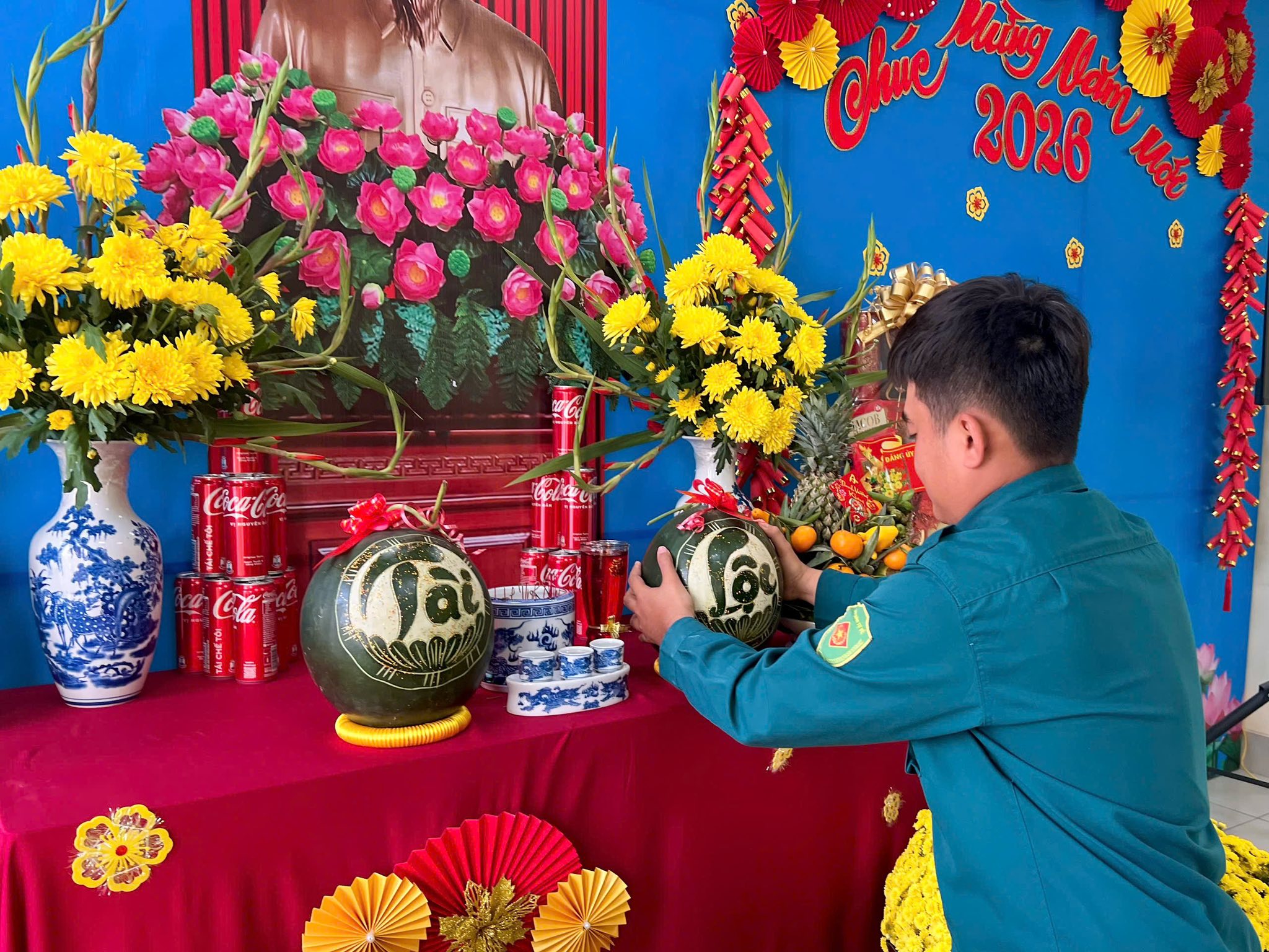 Trong không khí rộn ràng của mùa xuân mới, khu vực bàn thờ được chuẩn bị chu đáo với Quốc kỳ, ảnh Chủ tịch Hồ Chí Minh đặt ở vị trí trang trọng, cùng mâm ngũ quả, bình hoa tươi và bánh mứt ngày Tết. Từng chi tiết được sắp xếp hài hòa, vừa đảm bảo tính nghi lễ, vừa tạo nên không gian ấm cúng, thiêng liêng tại trụ sở đơn vị.