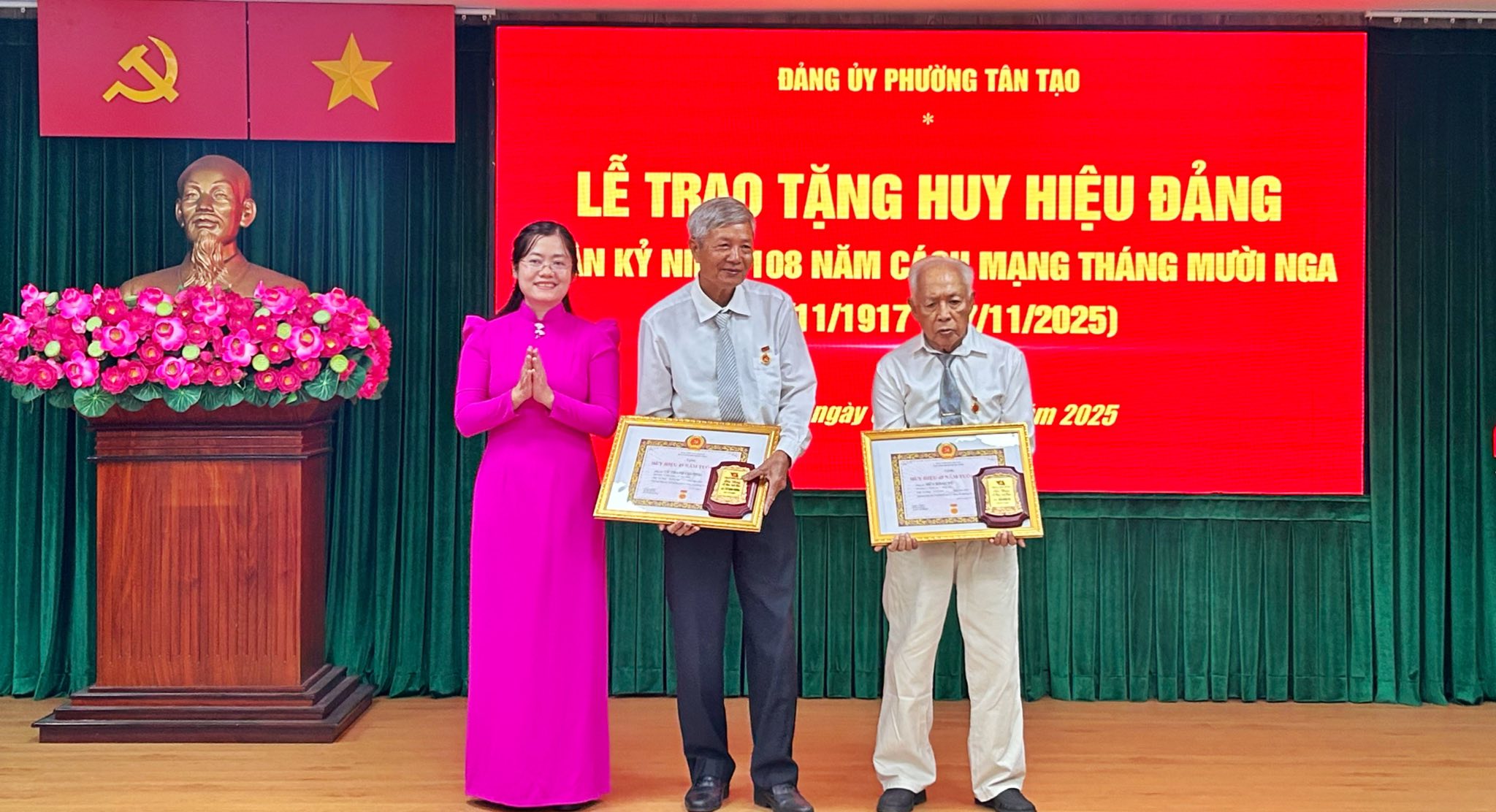 Cùng ngày, Đoàn công tác của Ban Thường vụ Đảng ủy phường Tân Tạo do đồng chí Lê Thị Ngọc Dung - Phó Bí thư Thường trực Đảng ủy làm trưởng đoàn đã đến trao tặng Huy hiệu 60 năm tuổi Đảng tại nhà cho 02 đồng chí Nguyễn Văn Cây - Đảng viên chi bộ Khu phố 56 và đồng chí Trần Kim Nên - Đảng viên chi bộ Khu phố 28 nhân Kỷ niệm 108 Cách mạng Tháng Mười Nga (07/11/1917 – 07/11/2025) do tuổi cao, sức yếu không thể tham dự Lễ trao huy hiệu Đảng tại phường.