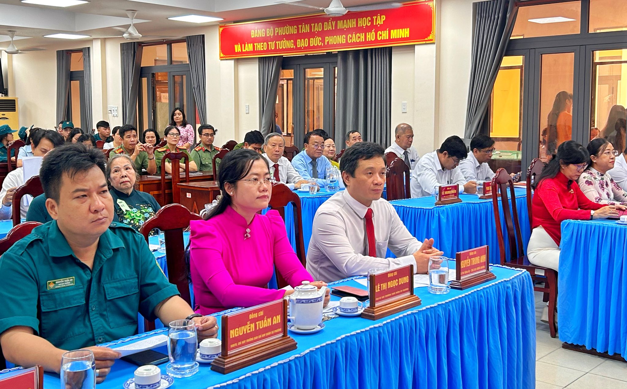 Tham dự có các đồng chí: Nguyễn Trung Anh - Bí thư Đảng ủy, Chủ tịch HĐND phường; Lê Thị Ngọc Dung - Phó Bí thư Thường trực Đảng ủy phường; Nguyễn Thị Hoàng Oanh - Phó Bí thư Đảng ủy, Chủ tịch Ủy ban nhân dân phường; các đồng chí Ủy viên Ban Thường vụ Đảng ủy phường; lãnh đạo các cơ quan tham mưu giúp việc Đảng ủy phường; lãnh đạo Ủy ban Mặt trận Tổ quốc Việt Nam và các tổ chức chính trị – xã hội phường; Ban Chỉ huy Công an, Quân sự phường; Cấp ủy các đảng bộ cơ sở, chi bộ cơ sở, chi bộ trực thuộc và 11 đồng chí đảng viên được nhận Huy hiệu Đảng.
