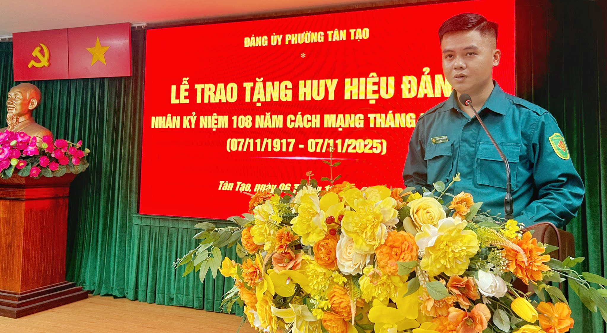 Đồng chí Cái Bảo Nhật Khanh – Ủy viên Ban Chấp hành Chi đoàn Quân sự phường đại diện tuổi trẻ phường Tân Tạo phát biểu ôn lại truyền thống Kỷ niệm 108 Cách mạng Tháng Mười Nga (07/11/1917 – 07/11/2025), bày tỏ lòng biết ơn vô hạn với những công lao to lớn của các thế hệ cha anh đi trước, sự đóng góp của các đồng chí lão thành cách mạng. Đồng chí Đỗ Thị Tuyết Nhung - Đảng viên 50 năm tuổi Đảng, Chi bộ Khu phố 34 đại diện 11 đồng chí nhận Huy hiệu Đảng bày tỏ niềm vinh dự khi đón nhận Huy hiệu Đảng, cảm ơn các đồng chí lãnh đạo trong tổ chức các cấp của Đảng, các đồng chí đảng viên đi trước, đảng viên cùng thời đã quan tâm, giúp đỡ.