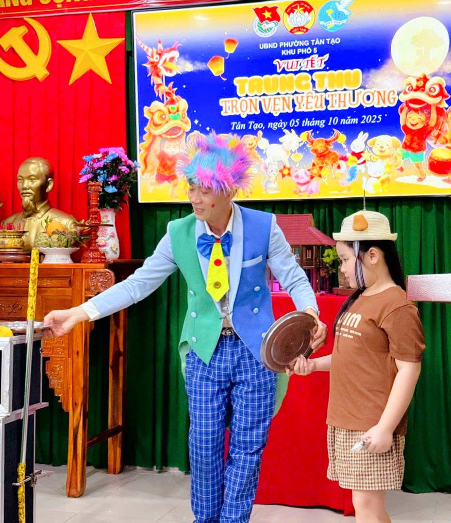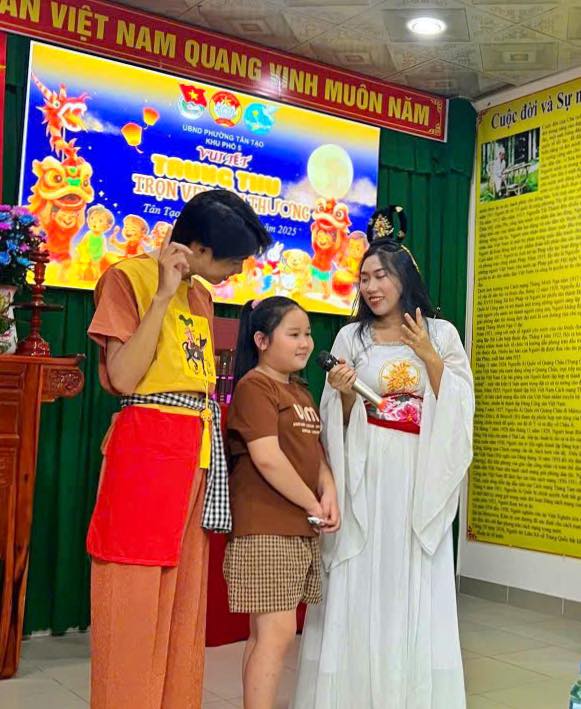 Đêm hội mang đến cho các em nhiều tiết mục văn nghệ đặc sắc như múa “Chú Cuội, Chị Hằng” do đoàn viên khu phố biểu diễn, cùng tiết mục xiếc – ảo thuật hấp dẫn của nhóm Huệ Nhân, tạo nên không khí vui tươi, rộn ràng và đầy ắp tiếng cười.