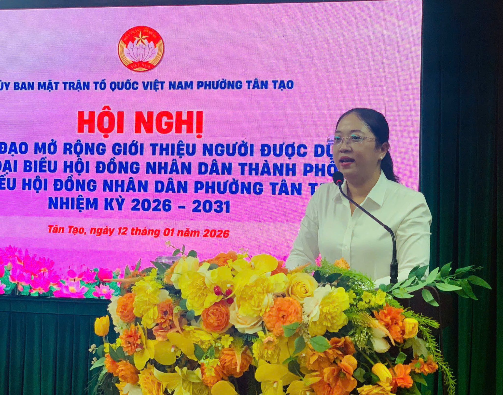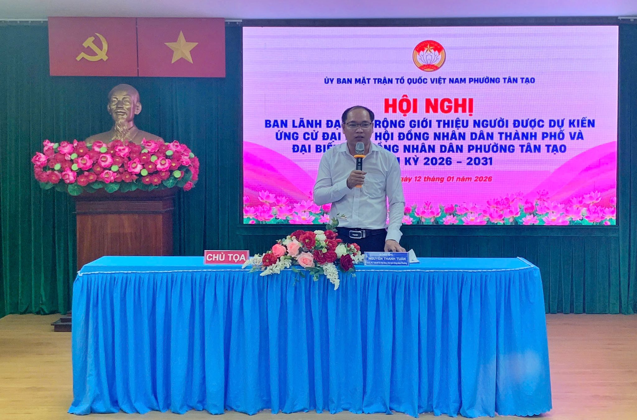 Thực hiện quy trình giới thiệu nhân sự ứng cử đại biểu HĐND TPHCM và HĐND phường Tân Tạo, nhiệm kỳ 2026 - 2031, chiều 12/01/2026, Ban Thường trực Ủy ban Mặt trận Tổ quốc Việt Nam phường tổ chức Hội nghị Ban lãnh đạo mở rộng giới thiệu người được dự kiến ứng cử đại biểu HĐND Thành phố và đại biểu HĐND phường Tân Tạo nhiệm kỳ 2026-2031 với sự tham dự của tập thể Ban Thường trực và cử tri được triệu tập là Ủy viên Ban Thường vụ các tổ chức chính trị - xã hội phường, Trưởng các tổ chức thành viên, Trưởng Ban Công tác Mặt trận 57 khu phố.