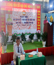 Cùng đại diện các đoàn thể và đông đảo Nhân dân khu phố tham dự Ngày hội trong không khí vui tươi, đầm ấm, thắm tình đoàn kết, là dịp để cán bộ và Nhân dân khu phố cùng nhìn lại chặng đường 95 năm vẻ vang của Mặt trận Tổ quốc Việt Nam.