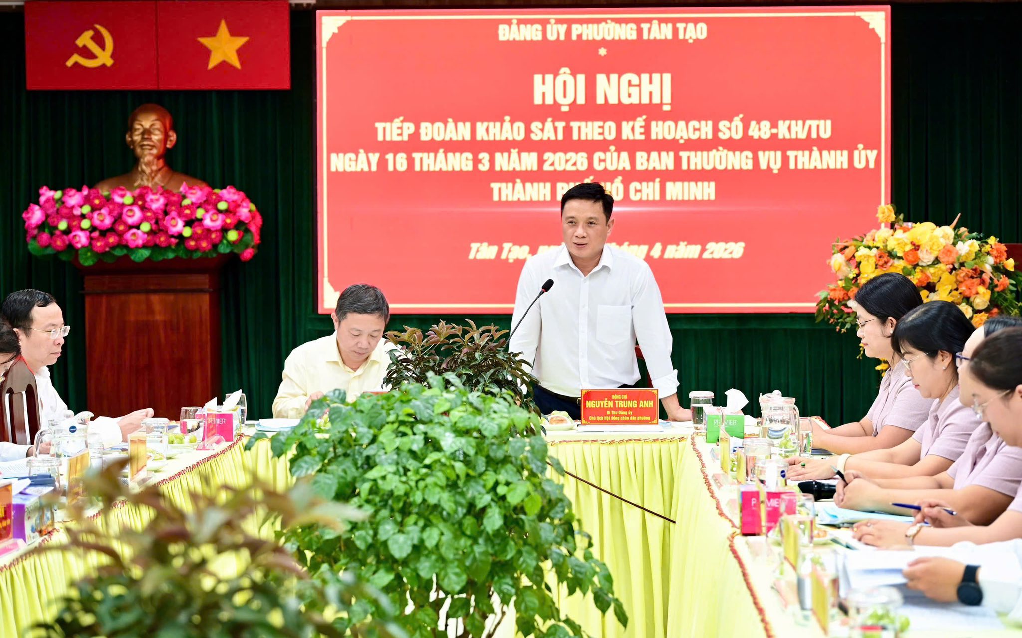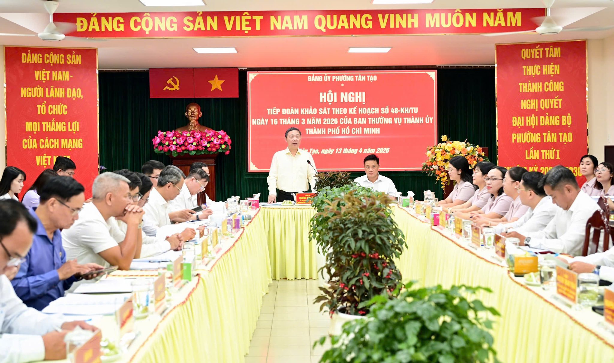 Chiều 13/4, Đoàn khảo sát Ban Thường vụ Thành ủy do đồng chí Dương Anh Đức, Ủy viên Ban Thường vụ Thành ủy, Trưởng Ban Tuyên giáo và Dân vận Thành ủy làm trưởng đoàn có buổi làm việc với Đảng ủy phường Tân Tạo về công tác lãnh đạo, chỉ đạo đối với hoạt động của Ủy ban MTTQ Việt Nam, tổ chức chính trị - xã hội; các hội quần chúng; tình hình hoạt động của người hoạt động không chuyên trách và công tác xây dựng Đảng, xây dựng tổ chức đảng trong các doanh nghiệp.