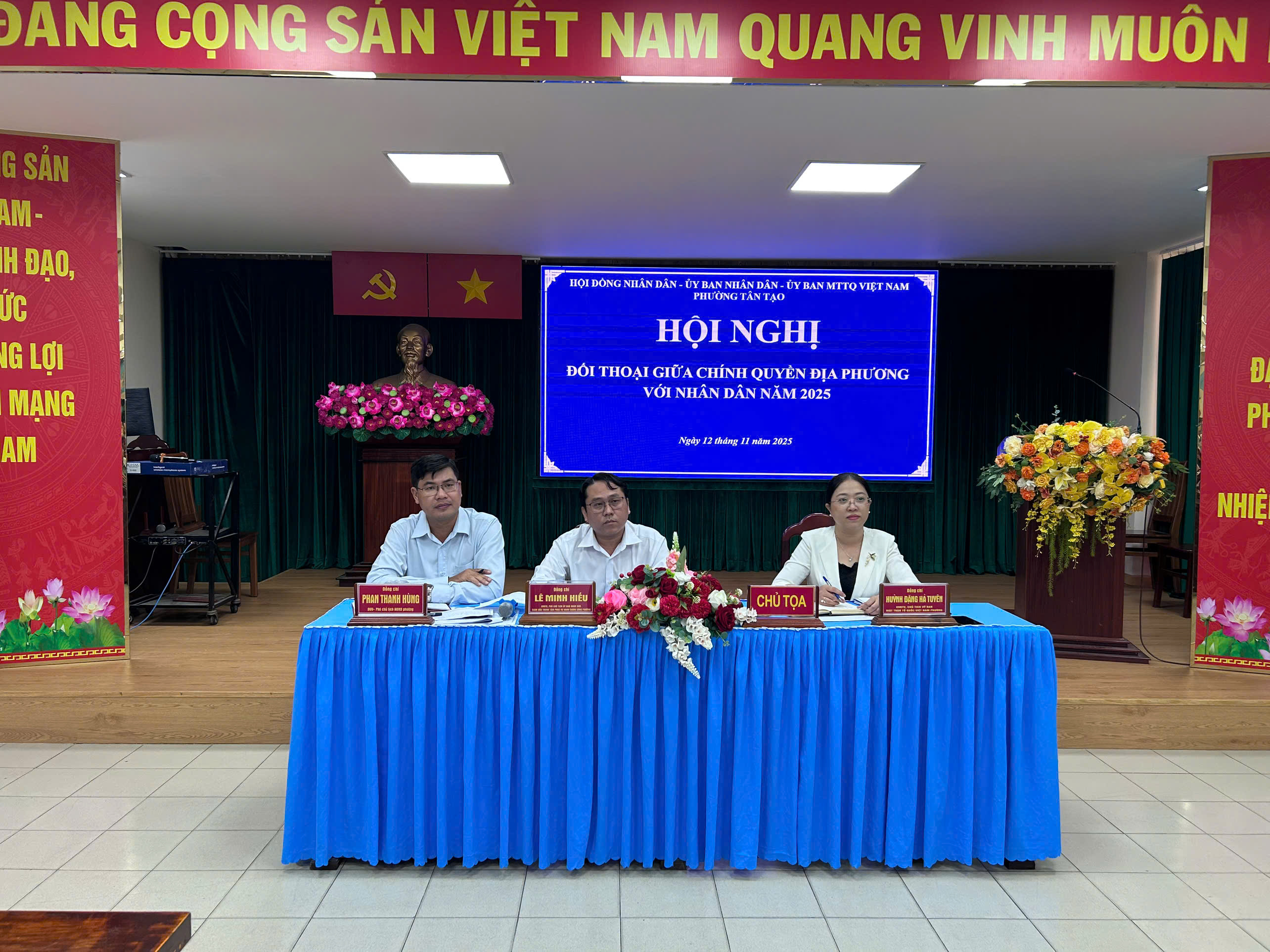 Thực hiện Kế hoạch phối hợp tổ chức Hội nghị đối thoại giữa chính quyền với Nhân dân năm 2025, sáng nay ngày 12 tháng 11 năm 2025, tại Hội trường UBND phường Tân Tạo. Ban thường trực Ủy ban Mặt trận Tổ quốc Việt Nam phường phối hợp với Hội đồng nhân dân và Ủy ban nhan dân phường tổ chức Hội nghị đối thoại giữa chính quyền với Nhân dân năm 2025.