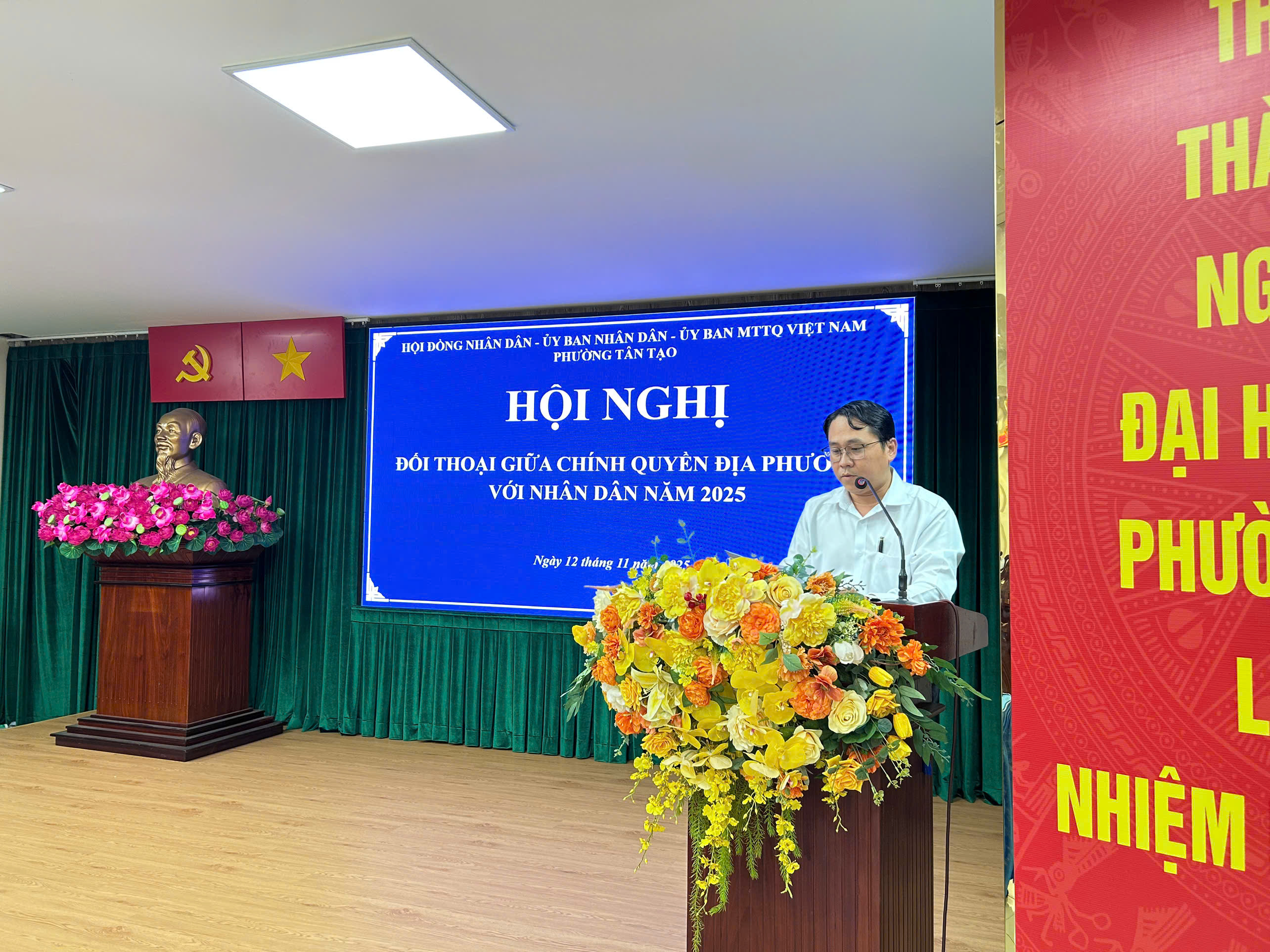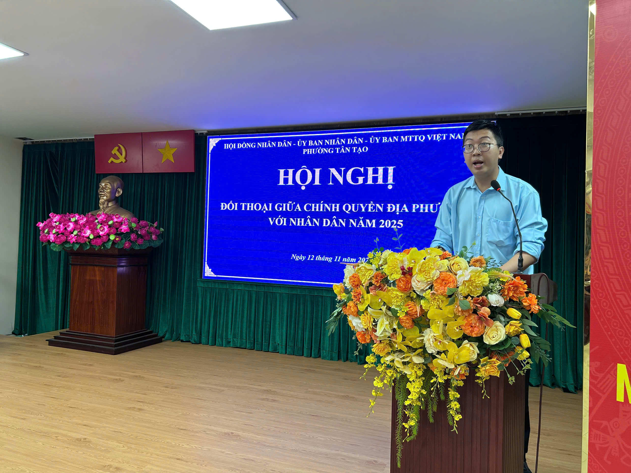 Phát biểu tại Hội nghị, đồng chí Lê Minh Hiếu – Phó Chủ tịch UBND phường đánh giá cao tinh thần dân chủ, trách nhiệm và sự đóng góp ý kiến thẳng thắn, mang tính xây dựng của Nhân dân. Đồng chí khẳng định chính quyền phường Tân Tạo luôn lắng nghe, tiếp thu và nỗ lực tháo gỡ khó khăn, đáp ứng nguyện vọng chính đáng của Nhân dân, hướng đến mục tiêu xây dựng phường Tân Tạo văn minh, hiện đại, nghĩa tình.