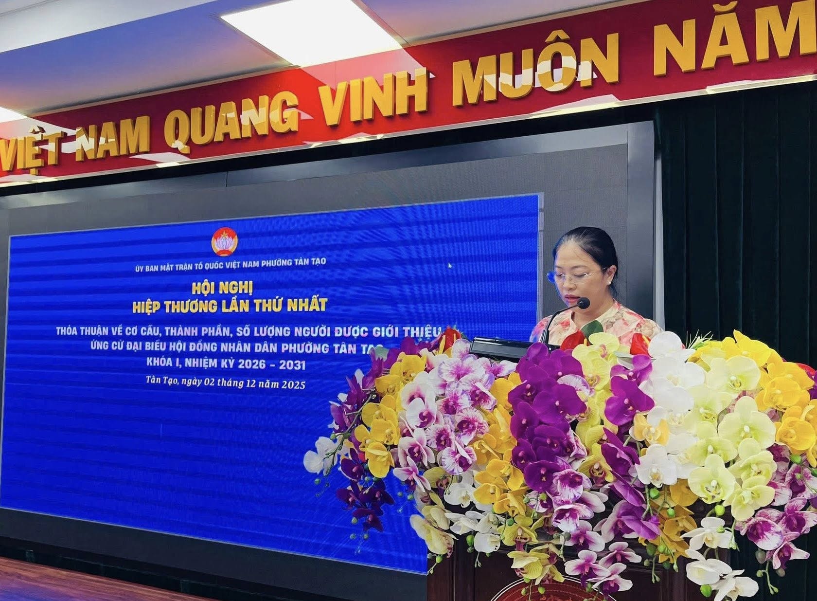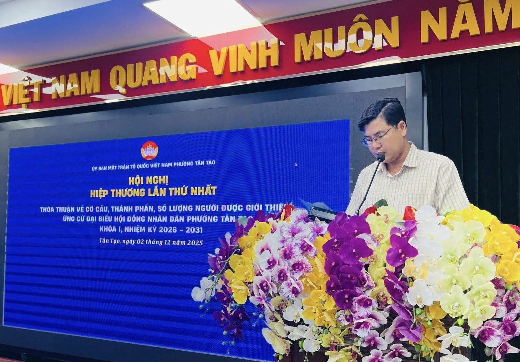 Chiều ngày 02/12/2025, Ủy ban Mặt trận Tổ quốc Việt Nam phường Tân Tạo tổ chức Hội nghị hiệp thương lần thứ nhất để thoả thuận cơ cấu, thành phần, số lượng người ứng cử đại biểu Hội đồng nhân dân phường Khoá I nhiệm kỳ 2026 - 2031.