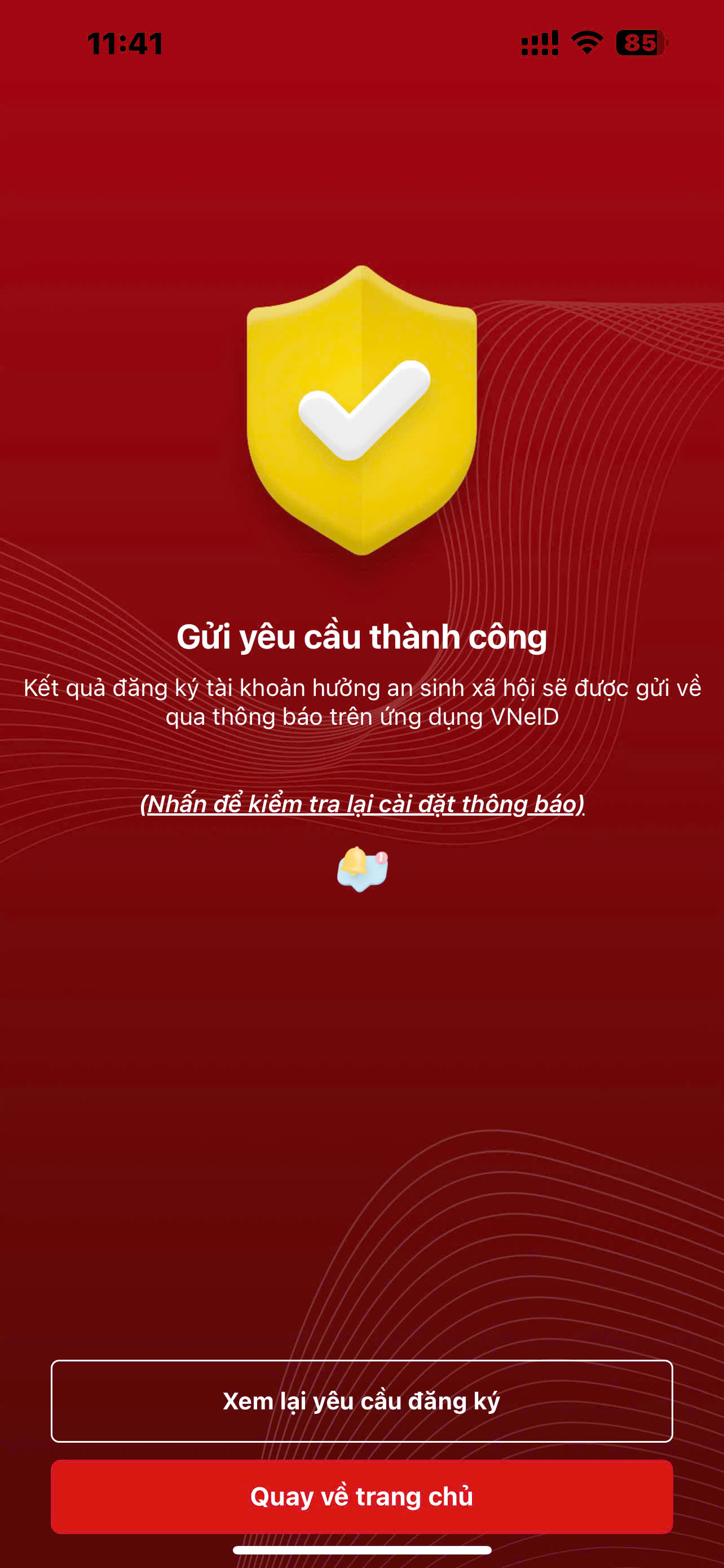 Bước 5: Bấm “Gửi thông tin”. Trên màn hình sẽ hiển thị xác nhận yêu cầu đăng ký tài khoản An sinh xã hội thành công.