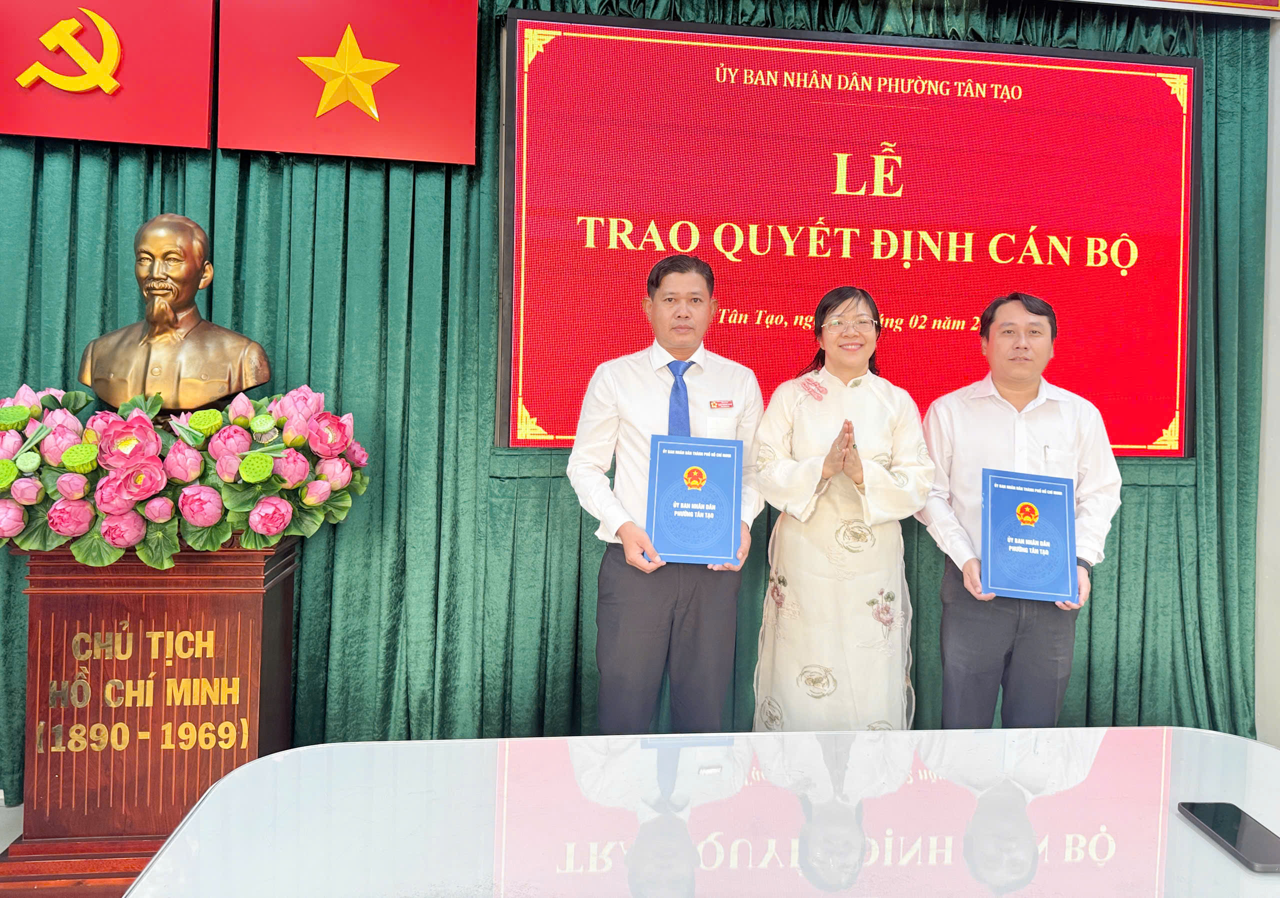 - Tiếp nhận và bổ nhiệm đồng chí Nguyễn Hồng Cẩm Vân, Nguyên Phó Giám đốc Trung tâm Văn hóa - Thể thao phường An Lạc giữ chức vụ Phó Giám đốc Trung tâm Cung ứng dịch vụ công phường Tân Tạo, thời hạn giữ chức vụ là 05 năm.